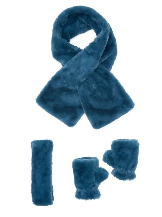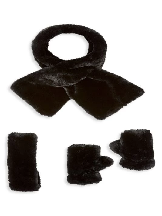 This three-piece set in a soft faux fur finish includes a headband, fingerless gloves, and a scarf. 100% polyester. Faux leather: 60% polyurethane/40% polyester. Dry clean. Imported.
