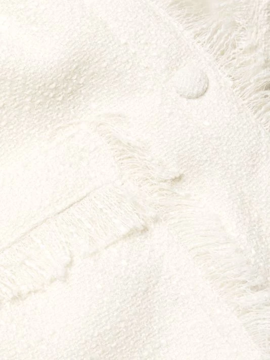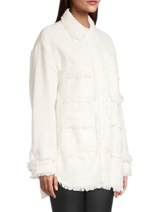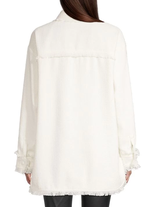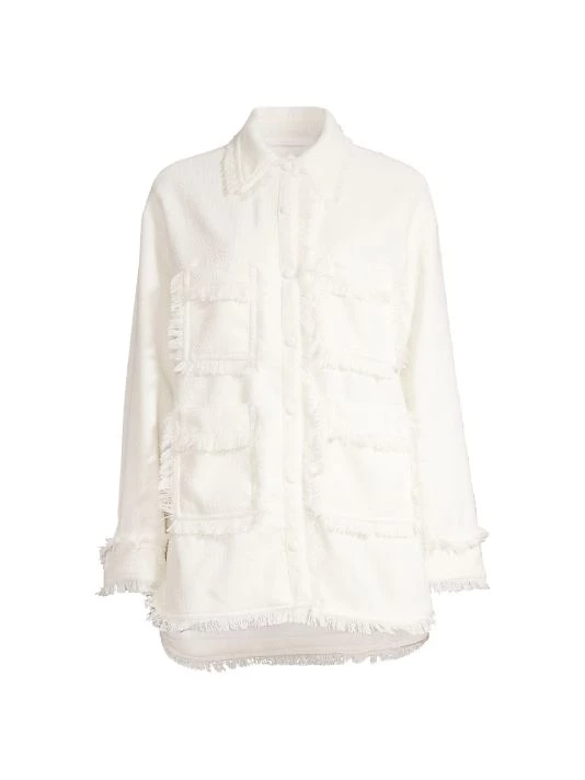 This textured shacket is adorned with patch pockets and tailored with barrel cuffs, updated with fringe trim.