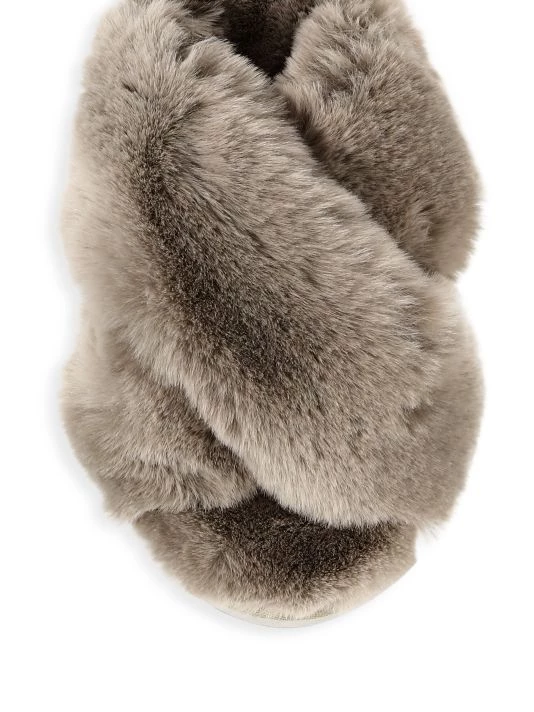 These plush faux fur slippers with a crisscross design exude glamour.