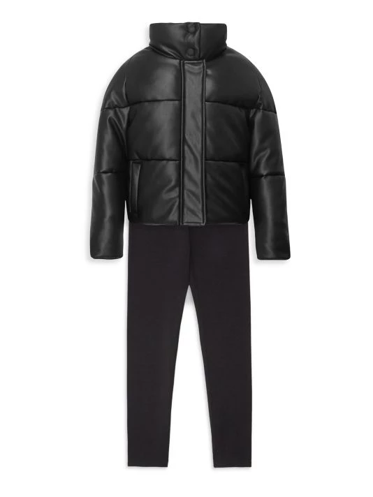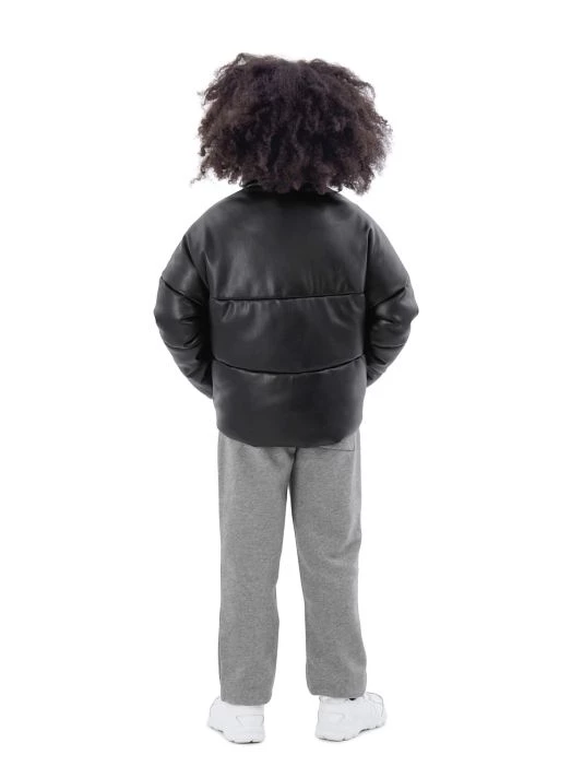 A relaxed-fit vegan leather puffer jacket features a stand collar.