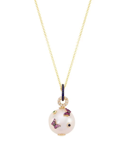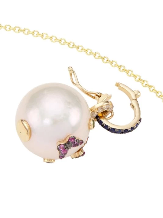 Nina Gilin’s 14K-yellow-gold necklace features a cultured South Sea pearl pendant that dangles from a blue-sapphire- and diamond-encrusted bail. Suspended from a fine cable chain, this lustrous gemstone is accented with sparkling round blue and green sapphires and ruby butterflies for a whimsical touch.