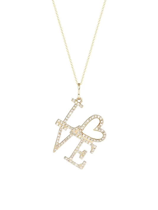 A decadent pavé of diamonds lines this charming stacked love pendant danging from a delicate yellow gold chain.