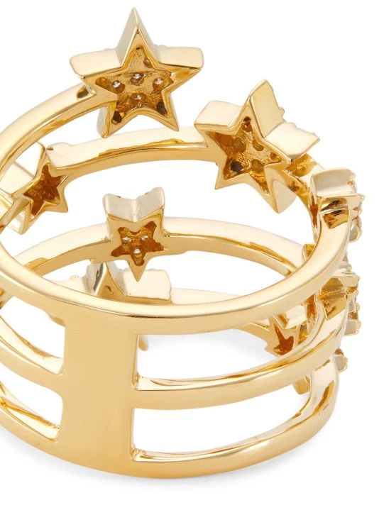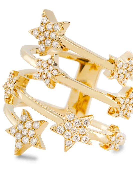 Crafted of polished 14K yellow gold, Nina Gilin’s spiral ring showcases shimmering diamond-encrusted stars.
