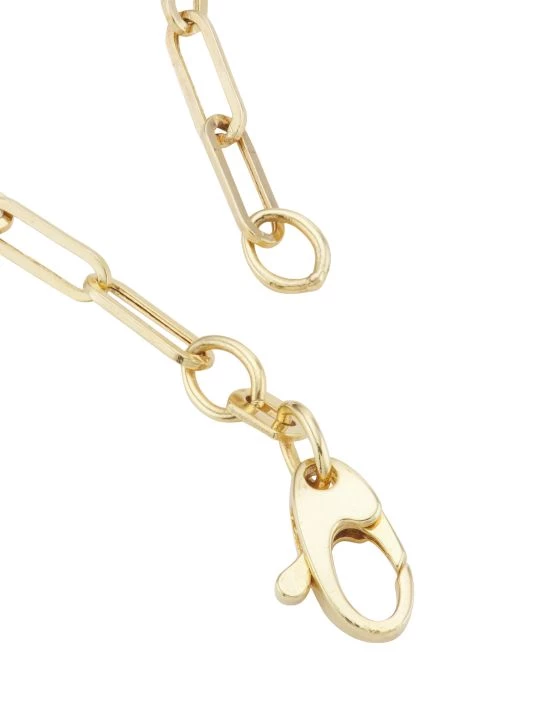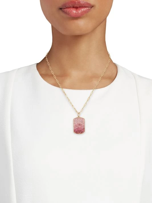 Crafted of 14K yellow gold, Nina Gilin’s necklace features a dog tag pendant encrusted with gradient pink sapphires. This shimmering embellishment is suspended from a fine paper-clip chain.