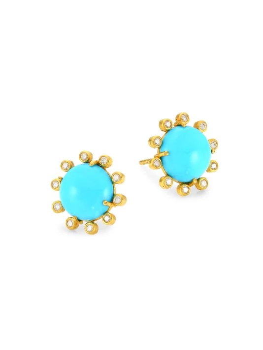 Vibrant natural turquoise cabochons gleam with luxurious diamond accents in an exaggerated sunburst shape.