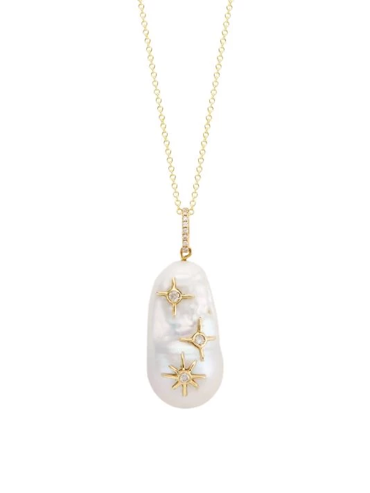 Made of 14K yellow gold, Nina Gilin’s necklace features a radiant white freshwater pearl pendant suspended from a fine cable chain. This lustrous gemstone is accented with round brilliant-cut diamonds resting in starburst-inspired settings.