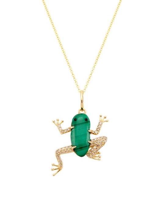 Crafted of 14K yellow gold, Nina Gilin’s necklace features a frog pendant suspended from a fine cable chain. This whimsical embellishment is accented with vibrant malachite and shimmering pavé diamonds.