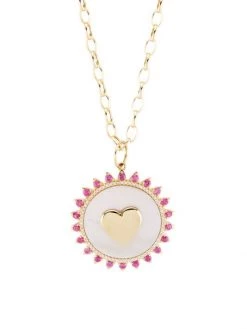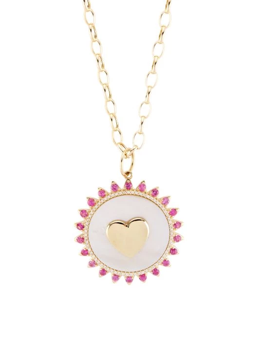 Crafted of 14K yellow gold, Nina Gilin’s necklace features a round heart pendant bordered by shimmering pink sapphires and pavé tsavorites.
