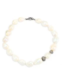 Exquisite necklace features the organic beauty of luminous baroque pearls punctuated by sparkling diamond spacers and clasp.