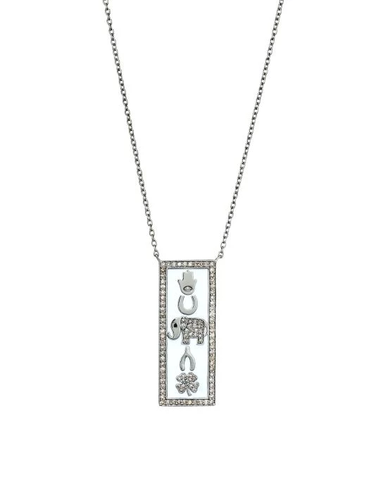 A silvertone chain suspends a pavé framed charm emblazoned with iconic luck and protection symbols.