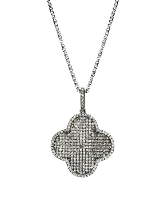 The quatrafoil, an ancient symbol for good luck, encrusted with diamond pavé on black rhodium-plated silver chain.