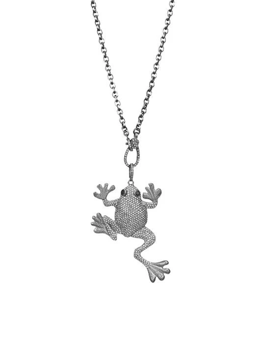 Dramatic diamond pavé frog pendant with sapphire eyes suspends from a cable chain.