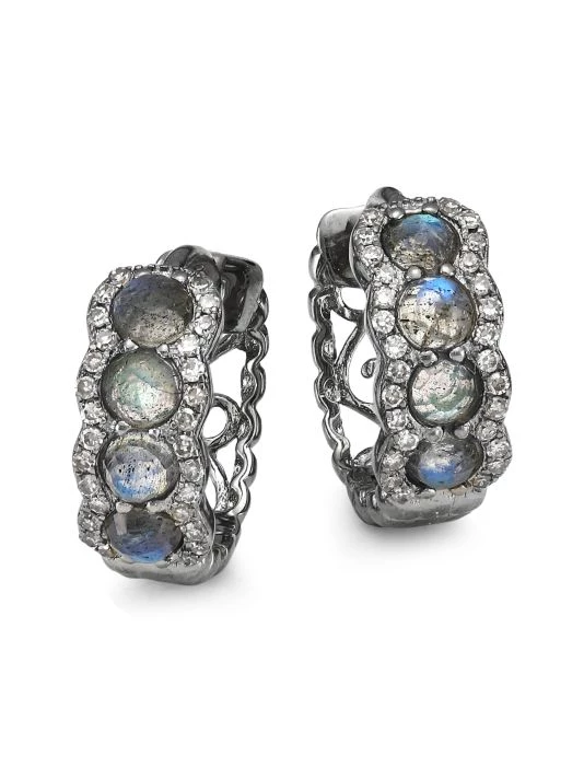 Huggie earrings crafted of black rhodium silver feature labradorite stones lined with delicate shimmering diamonds.