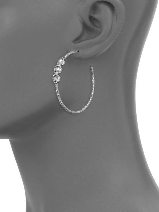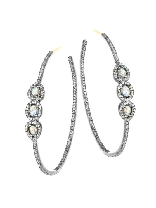 Sprinkled with diamonds, these brilliant hoop earrings flaunt teardrop-shaped labradorite stations.