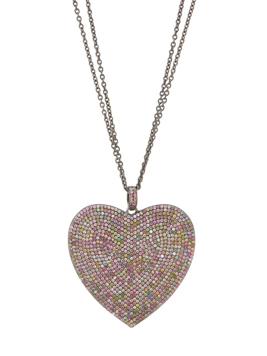 Crafted of black-rhodium-plated sterling silver, Nina Gilin’s necklace features a heart pendant pavé-set with multicolored tourmalines. This eye-catching embellishment is suspended from a double cable chain.